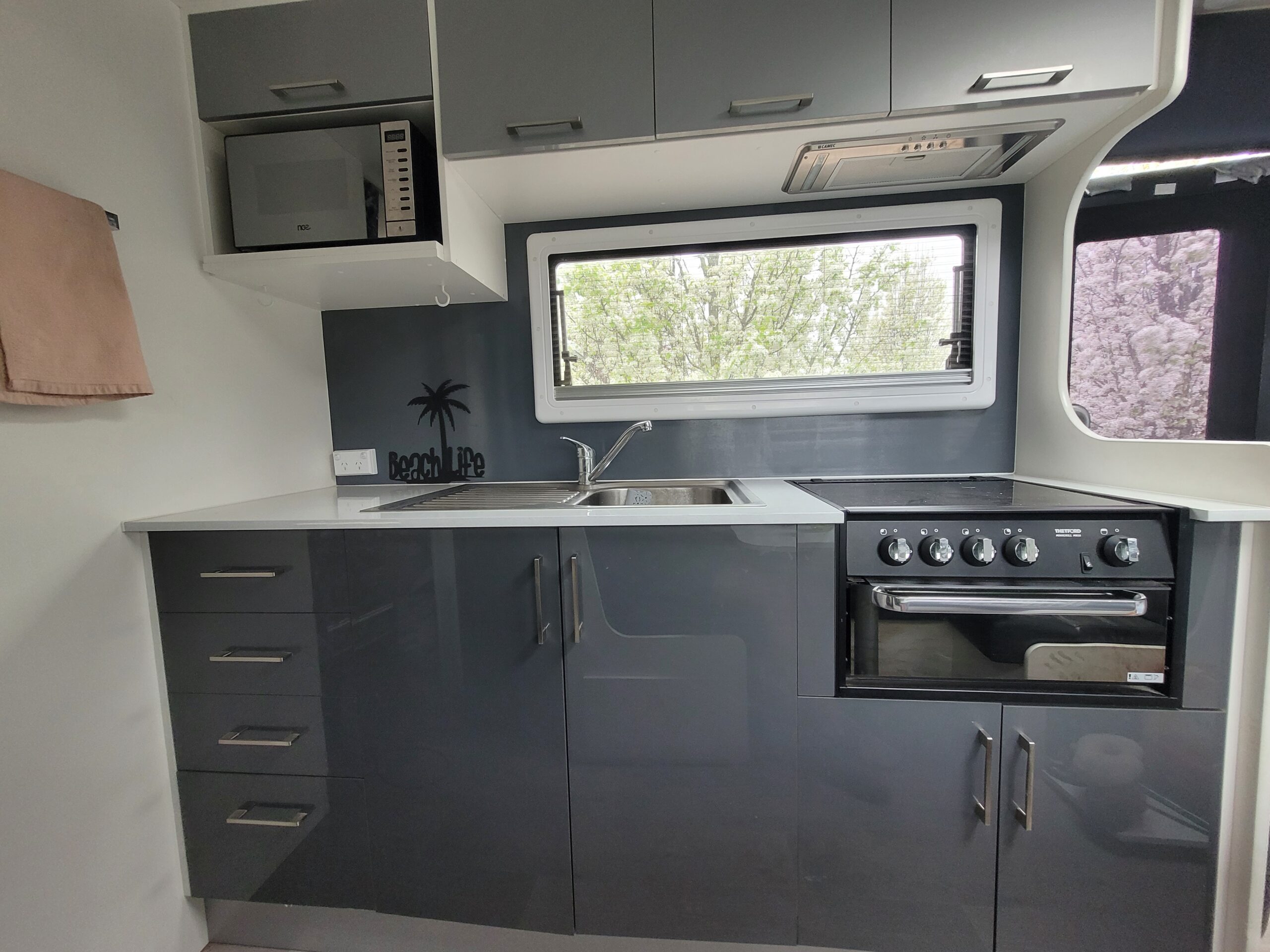 A practical kitchen with a large fridge, microwave and storage makes preparing family meals simple and stress-free, wherever you’re parked.